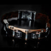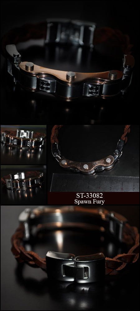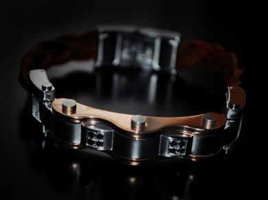 Gem Code: 31030 大きな機械の部品をイメージさせるデザインのブレスレット。近代アートのようなシンプルで奥深いデザインが腕を包む。無機質なステンレスと暖かなレザーが独特なコントラストを生み、ファッションに遊び心溢れるスパイスを加える。季節を通して愛用していただけるアイテムです。