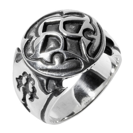 ボリューミーなシルバーの重さが心地よいアイテム。中世の芸術をイメージしたデザインが力強くロックアイコンをアピール。一点着けでも力を発揮する存在感をお楽しみいただける。