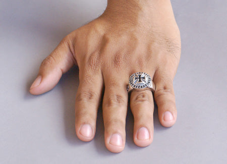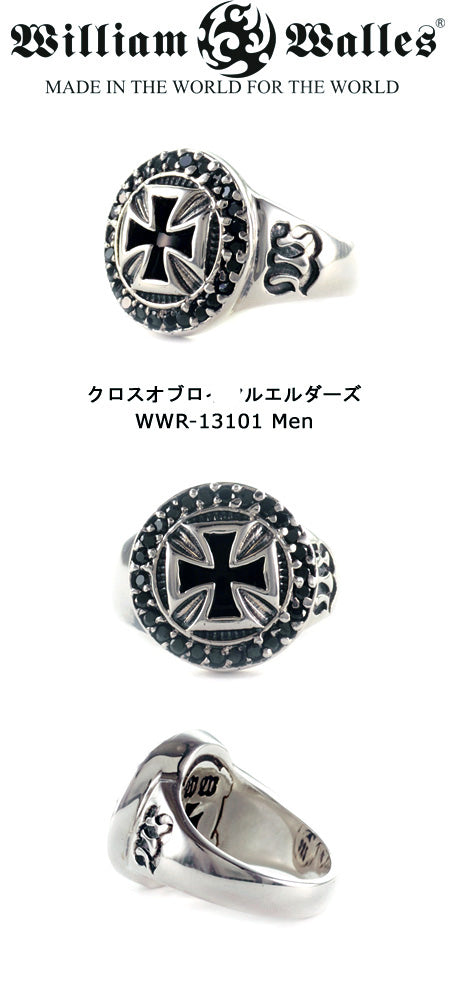 ウィリアムウォレスがお送りするクールなシルバーリング「クロスオブロイヤルエルダーズ」。 まるで強固な盾のようにも見えるクロスのフロントモチーフ。ぐるりと取り囲むように配された黒い輝きが存在感をアップさせています。 このリングは純銀925を使用しているため、耐久性に優れ、抜群の使用感を提供しています。 specs: 27x7x18mm, weight: 16.03grams