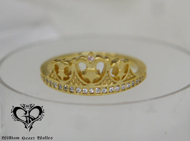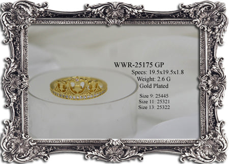 ユリモチーフのエレガントなティアラリングです。イエローゴールドコーティング加工が施されております。周りにはホワイトジルコニアでキュートで透明感のあるリングに仕上げました。他のお色でピンクゴールドコーティングもございます。 GEM ID: #9 -25445 #11-25321 #13-25322 Specs: 21mm x 19.5mm x 2.5mm Weight: 3.4g Gold Plated